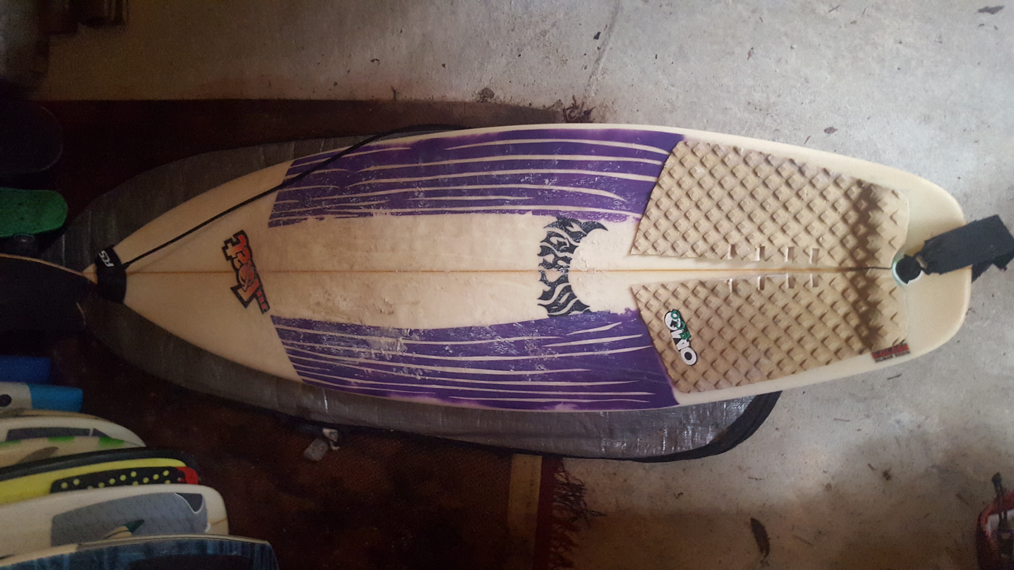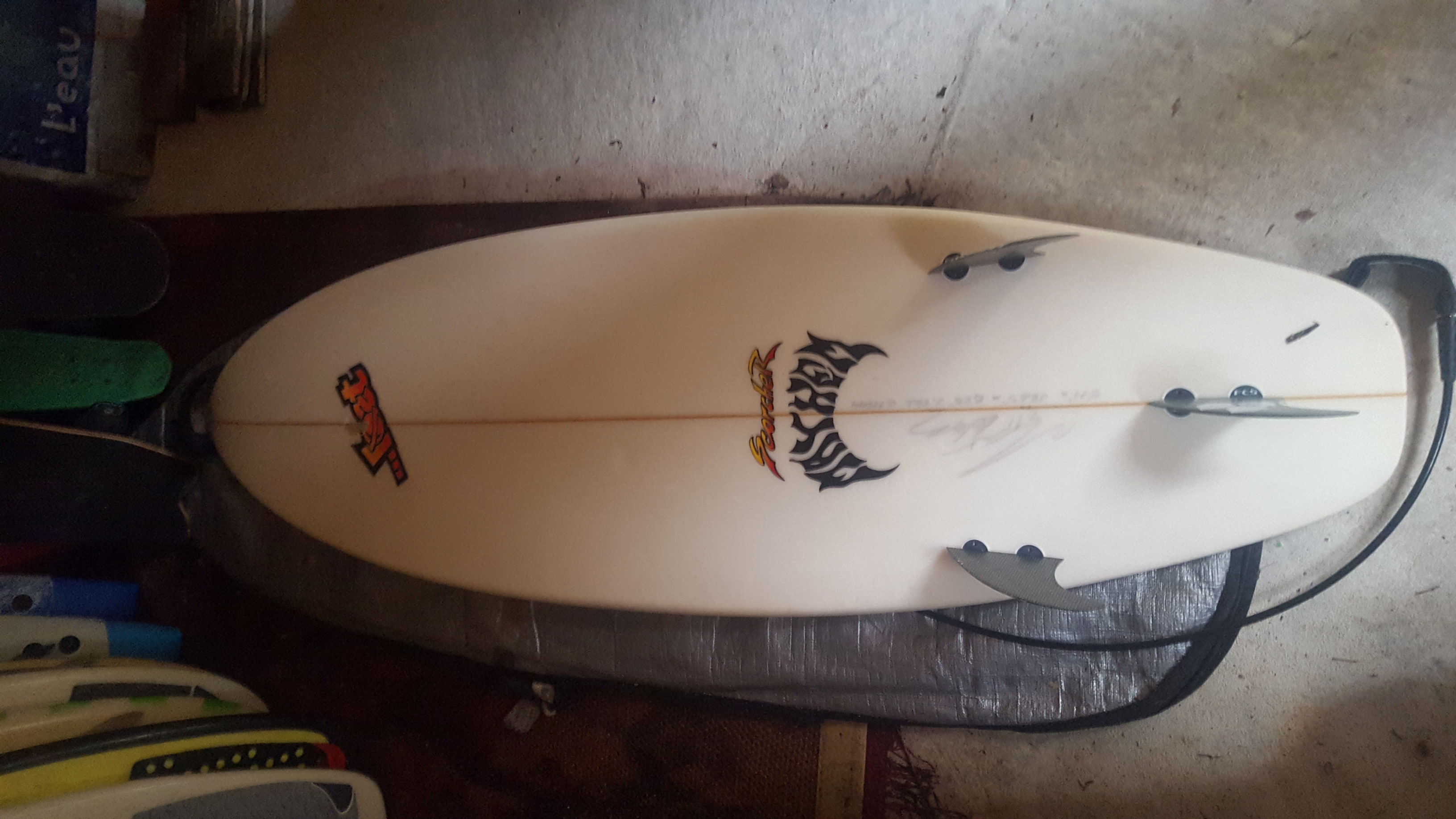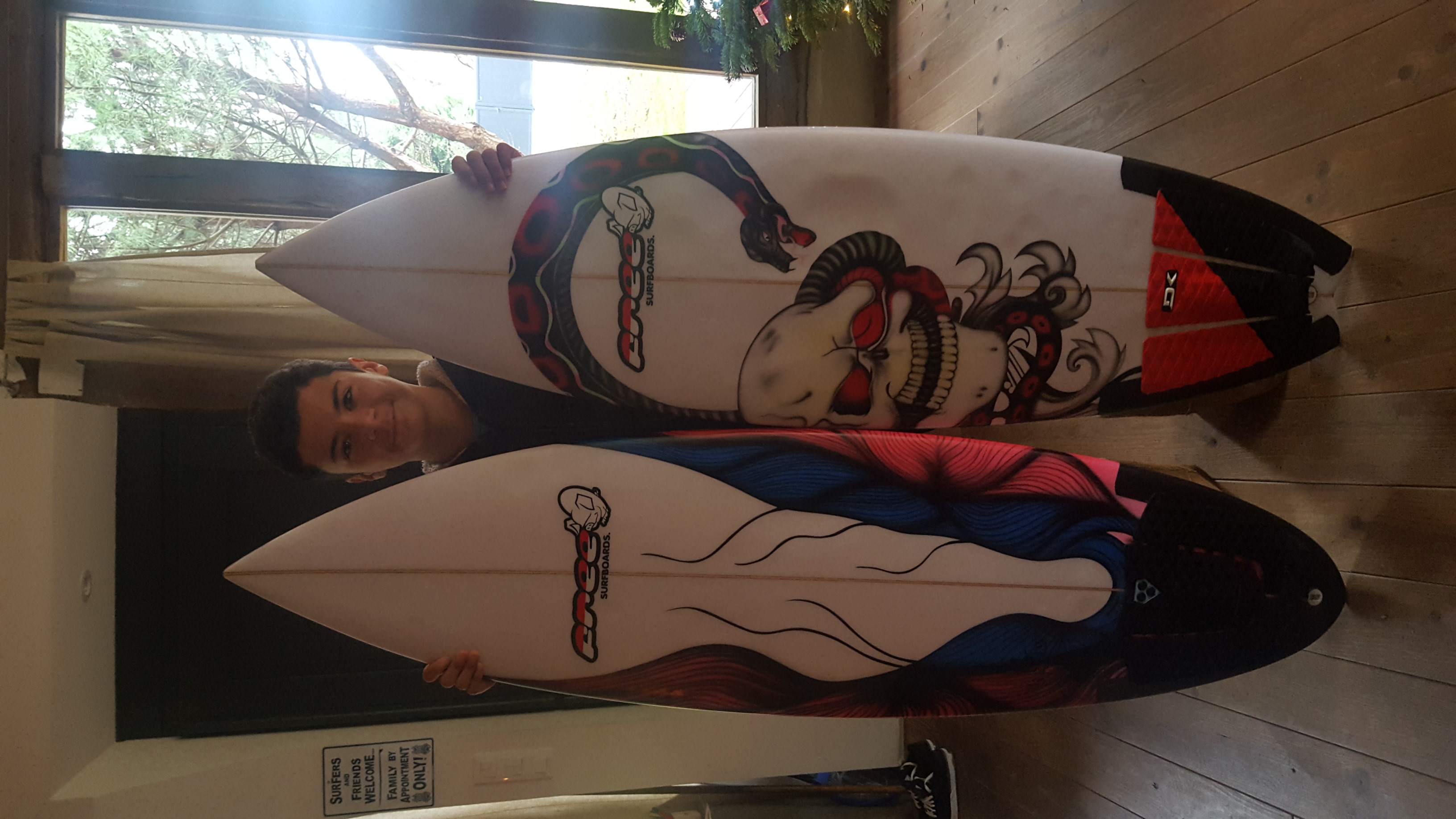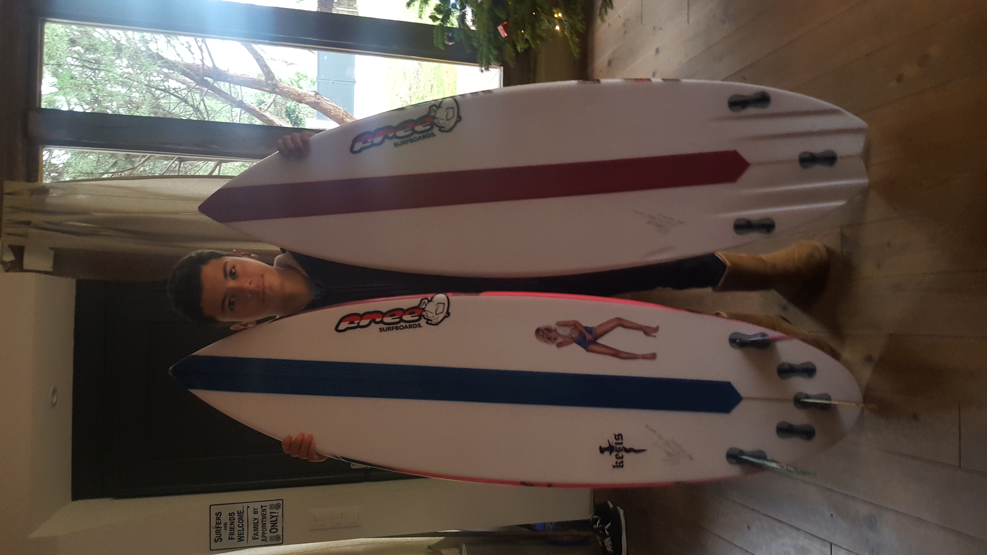 Le plus jeune de mes fils a aussi renouvelé son matos vu qu il a pris 10cm et quelques kilos . Craquage donc sur une 5'6 pour enfiler des barrels et une 5'4 pour le surf estival . 2 boards shapees a Bali , super shape et belle qualité.