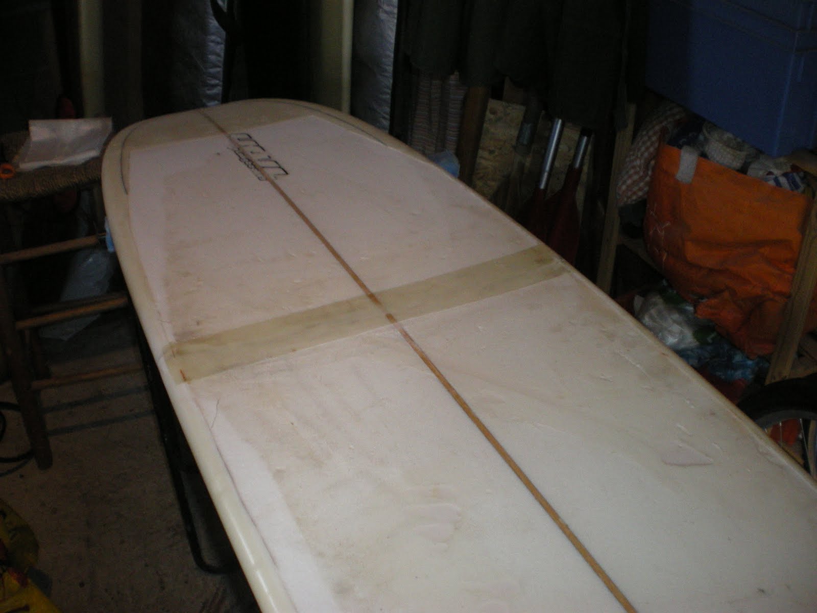 Appliqué aux dégâts de ma planche, je pensais découper à la scie circulaire une bande de la carapace de plastoque 10 à 15 cm de chaque coté de la ligne, poncer encore 5 à 10 cm du plastoque, rembourer la fissure dans le foam à la résine Epoxy, puis fibre, etc...répa classique d´un longboard...