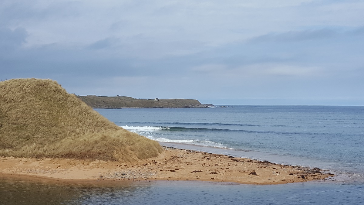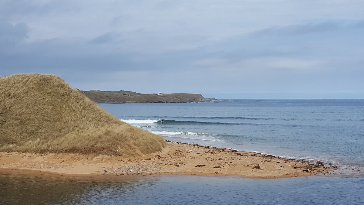 le lendemain lundi 22/04 j'ai dormi à Thurso pour guetter la droite car je sais que la compétition est finie, je me lève à 5h du matin pour voir passer quelques vagues et un line up vide, je rentre rapide au camping car pour prendre ma planche et ma combi....à noter que ma femme ne m'a pas préparé mon petit déjeuner, malgré le bordel que je fais dans le camping car, elle continue de faire semblant de dormir.