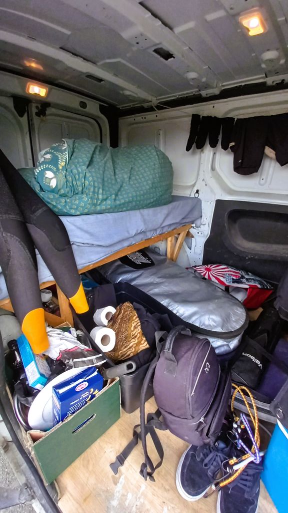 Mercredi, premier à l’eau...vers 9h pétantes ! Y'a pas mal de surfeurs qui dorment dans leur bagnole, dans la rue en pente, en face du spot, mais ils ne se lèvent pas pour surfer... Moi, je suis aller dormir sur un parking plat à 1km et, sans me presser, je suis largement prêt avant eux.