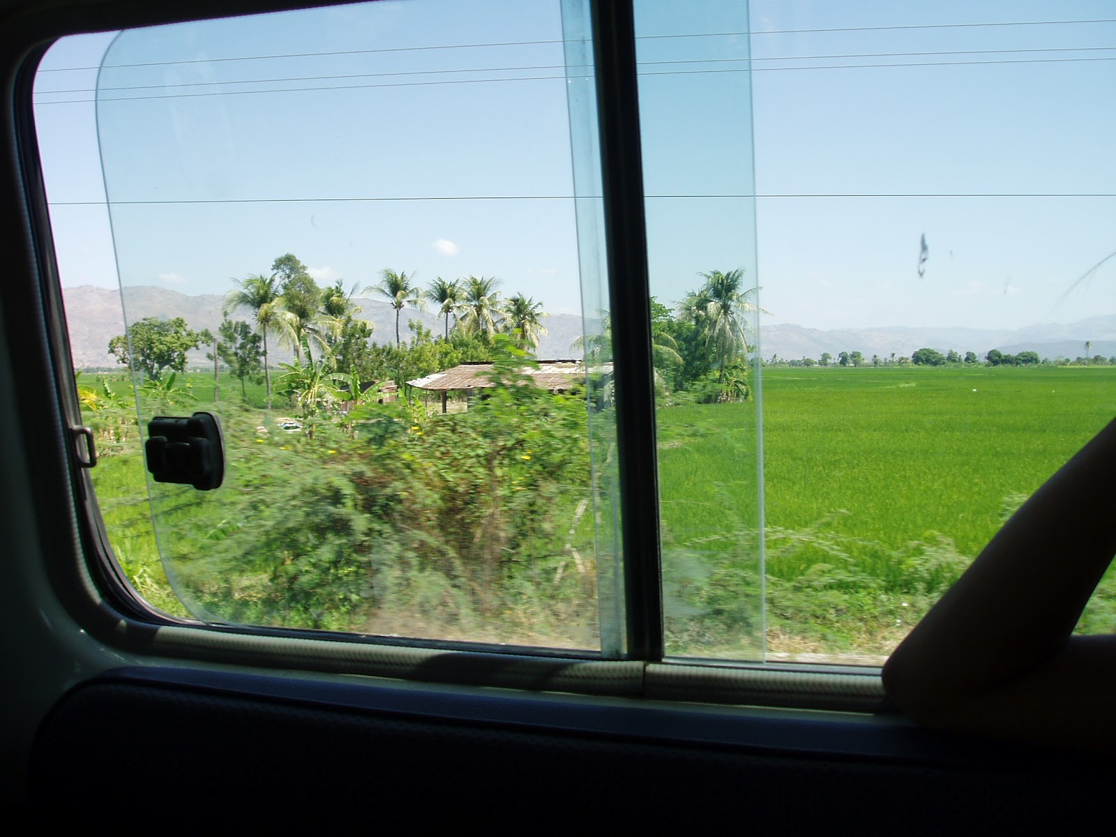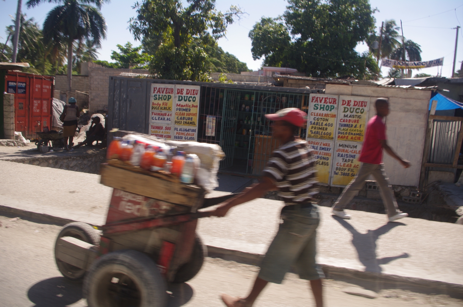 Sur la route, nous croisons des bus, des "faux-bus" (bus qui ne s'arrêtent pas), des camions américains, des 4x4, une moto en panne chargée sur une moto qui roule, des bananes frites, de l'eau en sachets plastiques (les vendeurs crient : « dlo ! »), des bananiers, des camps de réfugiés, des vaches, des chèvres, des convois d' UN, un convoi d'officiels avec escorte et flingues en évidence, des porteurs et des porteuses. Et moi, je croise les doigts pour qu'on arrive entier.