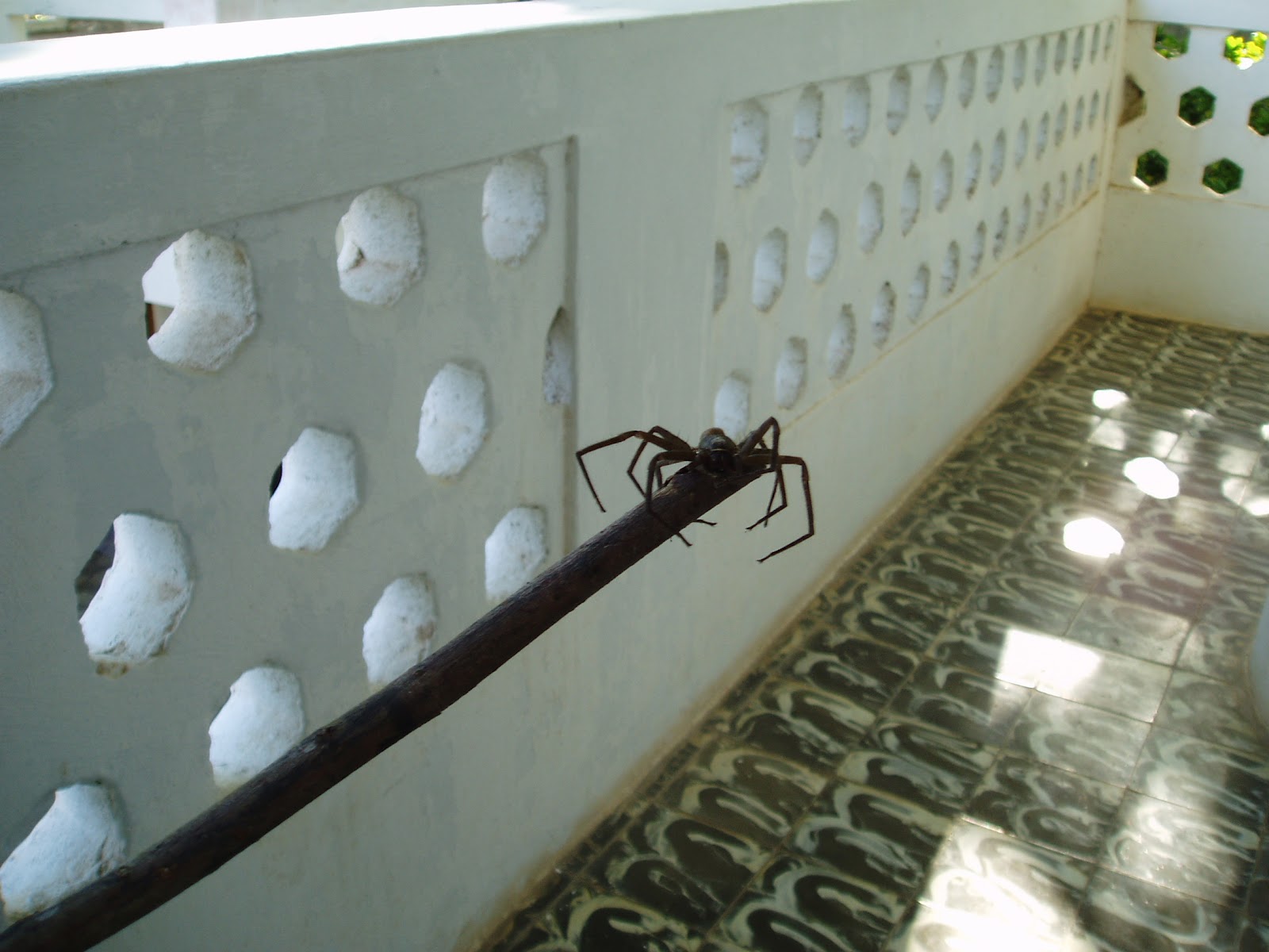 On ne sais pas ce que c'est. Je n'ai vu que les photos en rentrant du surf mais elle a l'air énorme sur le manche à balai. Au début, on a pris ça pour une mygale mais ça n'est pas ça. La mygale est beaucoup plus poilue comme on l'a vu dans notre logement suivant. ;)