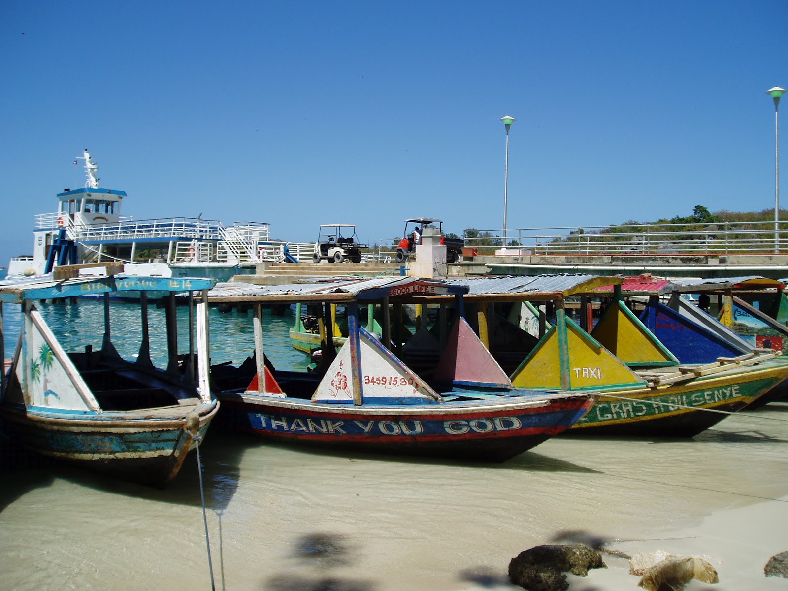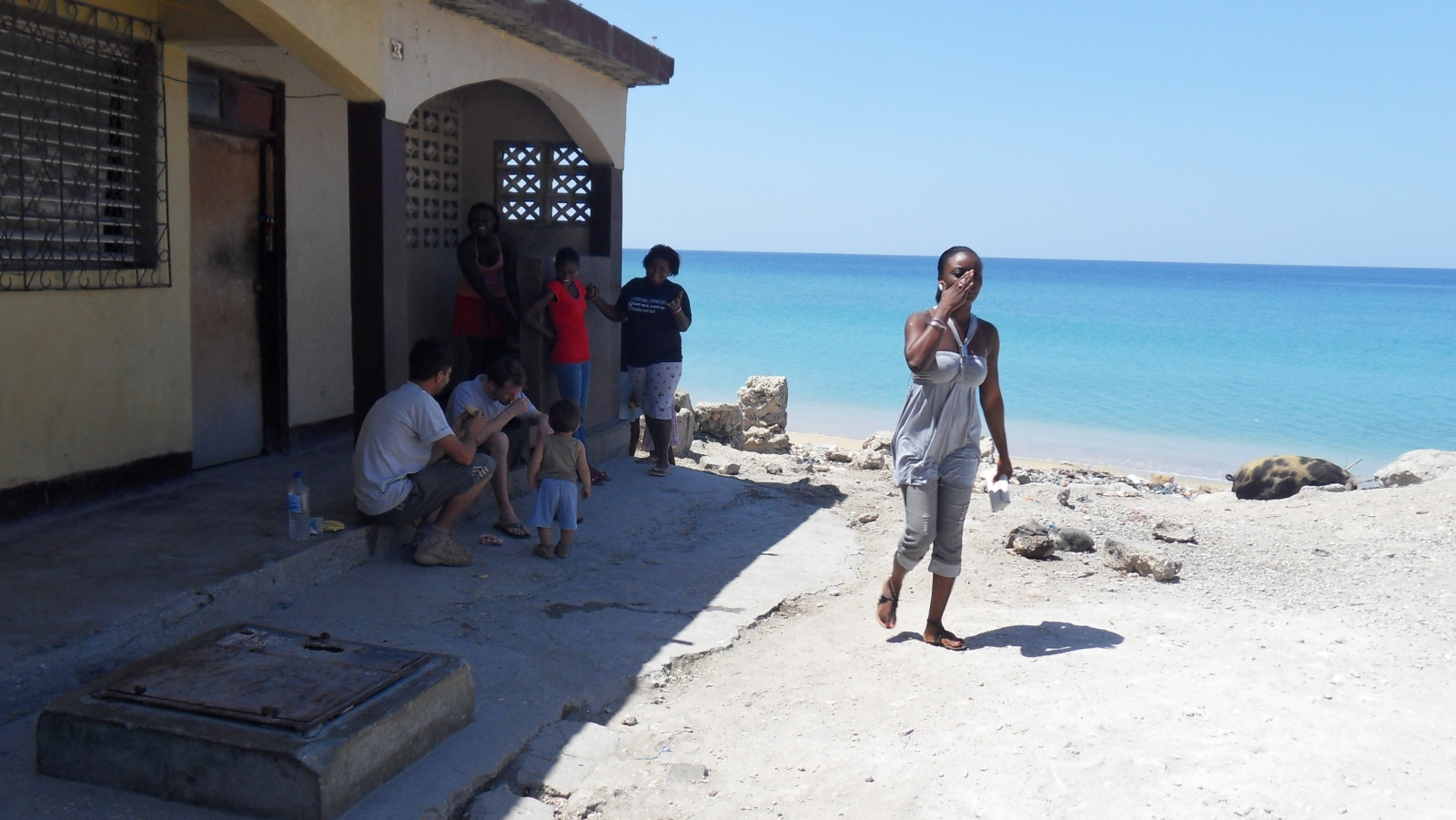 En arrière plan, les voiturettes, le ponton et le bateau, c'est Coco Beach pas Haïti.